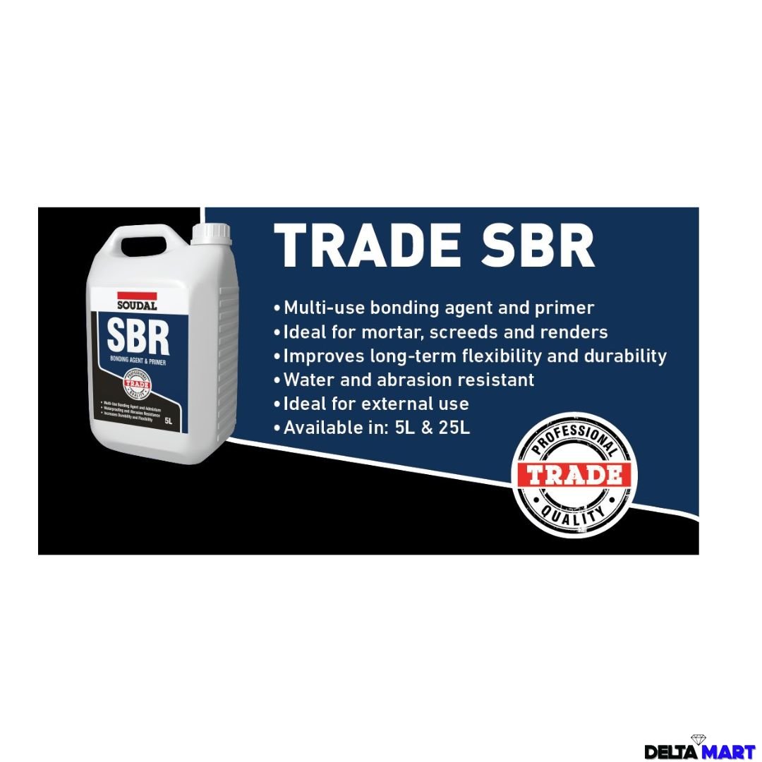 Soudal SBR Bonding Agent & Primer (5 Litre Can) is a multi-purpose styrene-butadiene emulsion. It is designed to improve adhesion, flexibility, and waterproofing in cement-based applications. Additionally, it is perfect for home renovations, repairs, and professional jobs. As a result, it ensures reliable performance both indoors and outdoors.